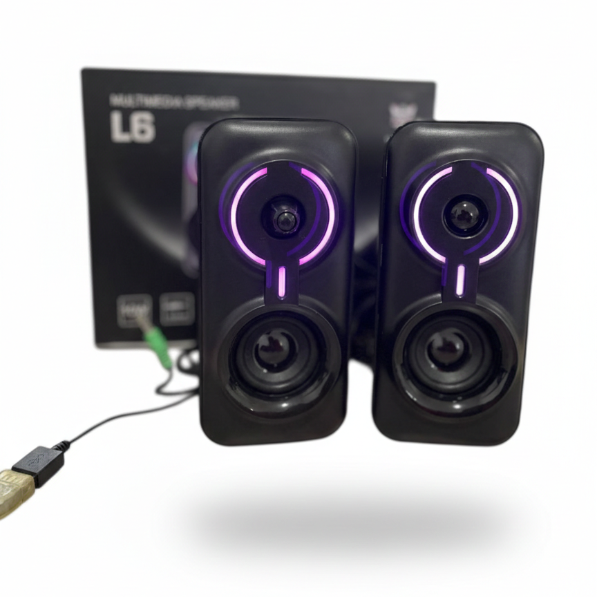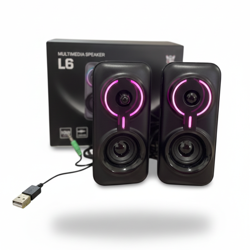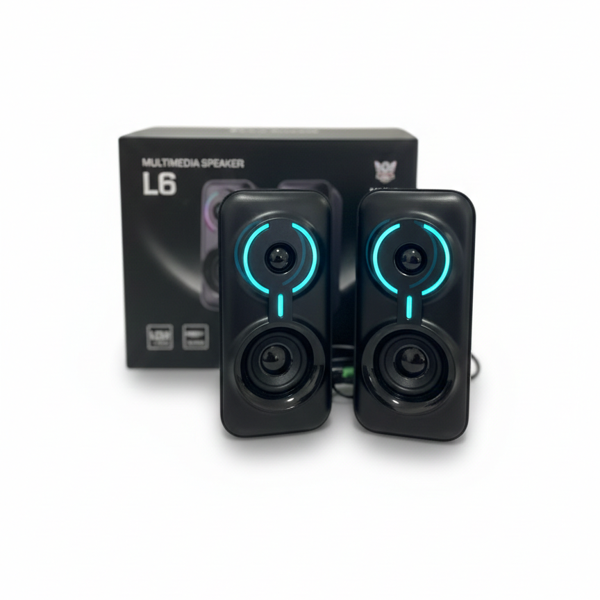 Parlantes Onikuma L6 RGB, sistema de altavoces estéreo 2.0 diseñado para gaming y entretenimiento, que ofrece conectividad versátil y un sonido Hi-Fi con iluminación RGB personalizable.